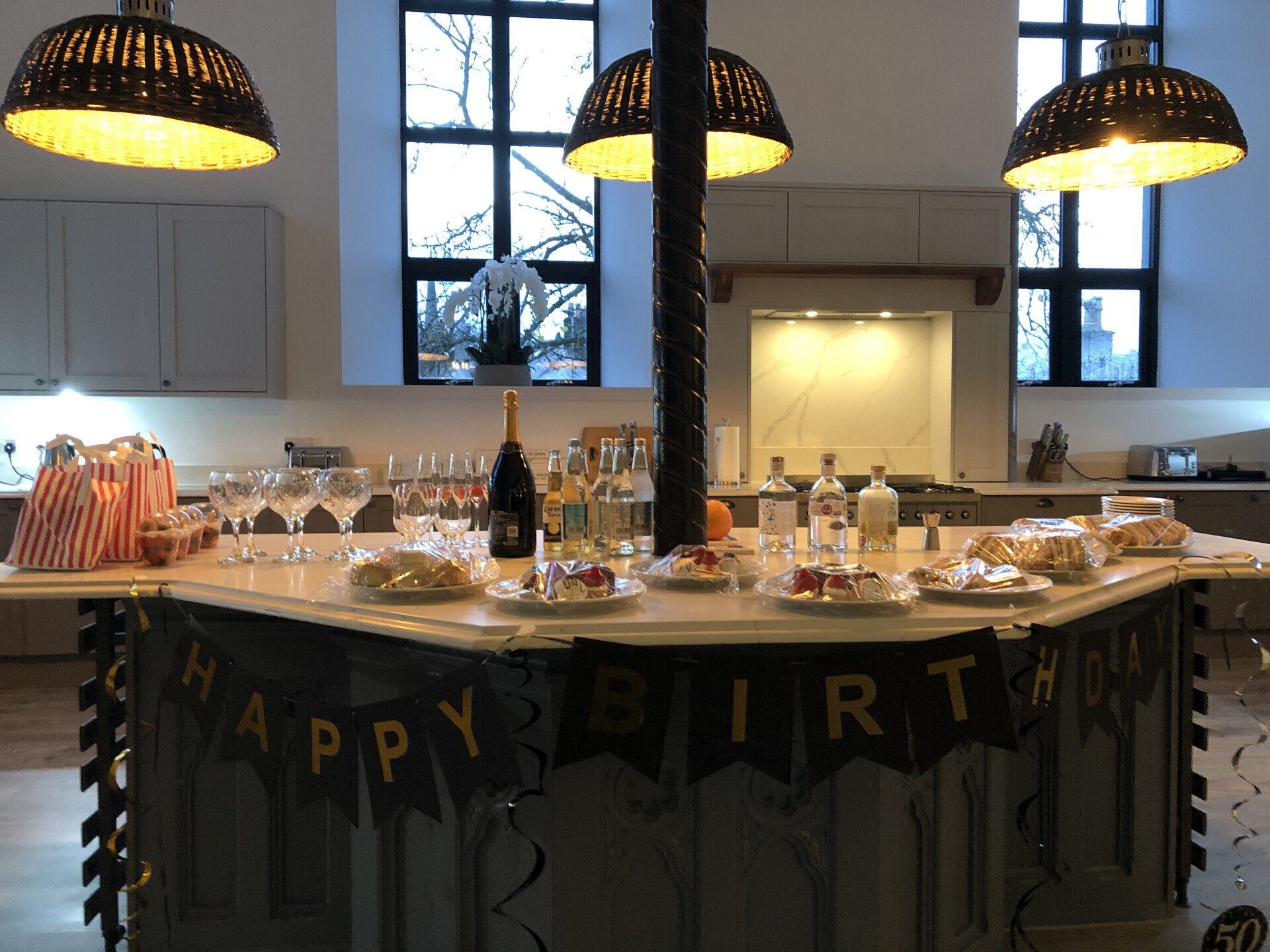 Middle Floor: Main hall comprising artwork on display from the John Hastie Museum Trust. 1 Double bedroom with super-king bed. Bathroom with separate shower / bath. Open-plan area comprising: Living room with seating for 14 guests, wood burning stove & view off the original stained glass windows; Two casual seating areas with seating for 2 x 3 guests. Kitchen area with island seating for 5 guests. Dining room with seating for 20 guests (highlight being the long “last supper” table fit for a king / queen).